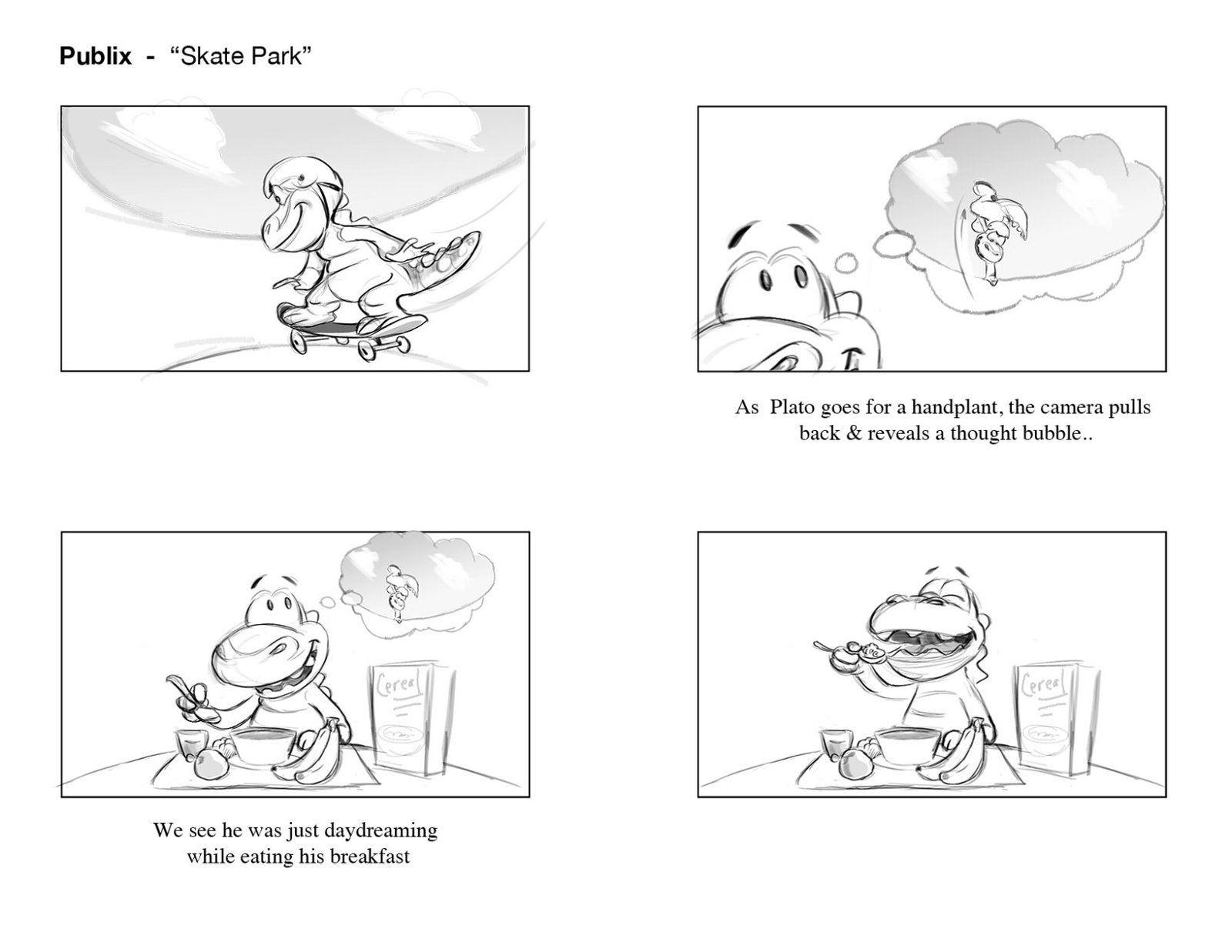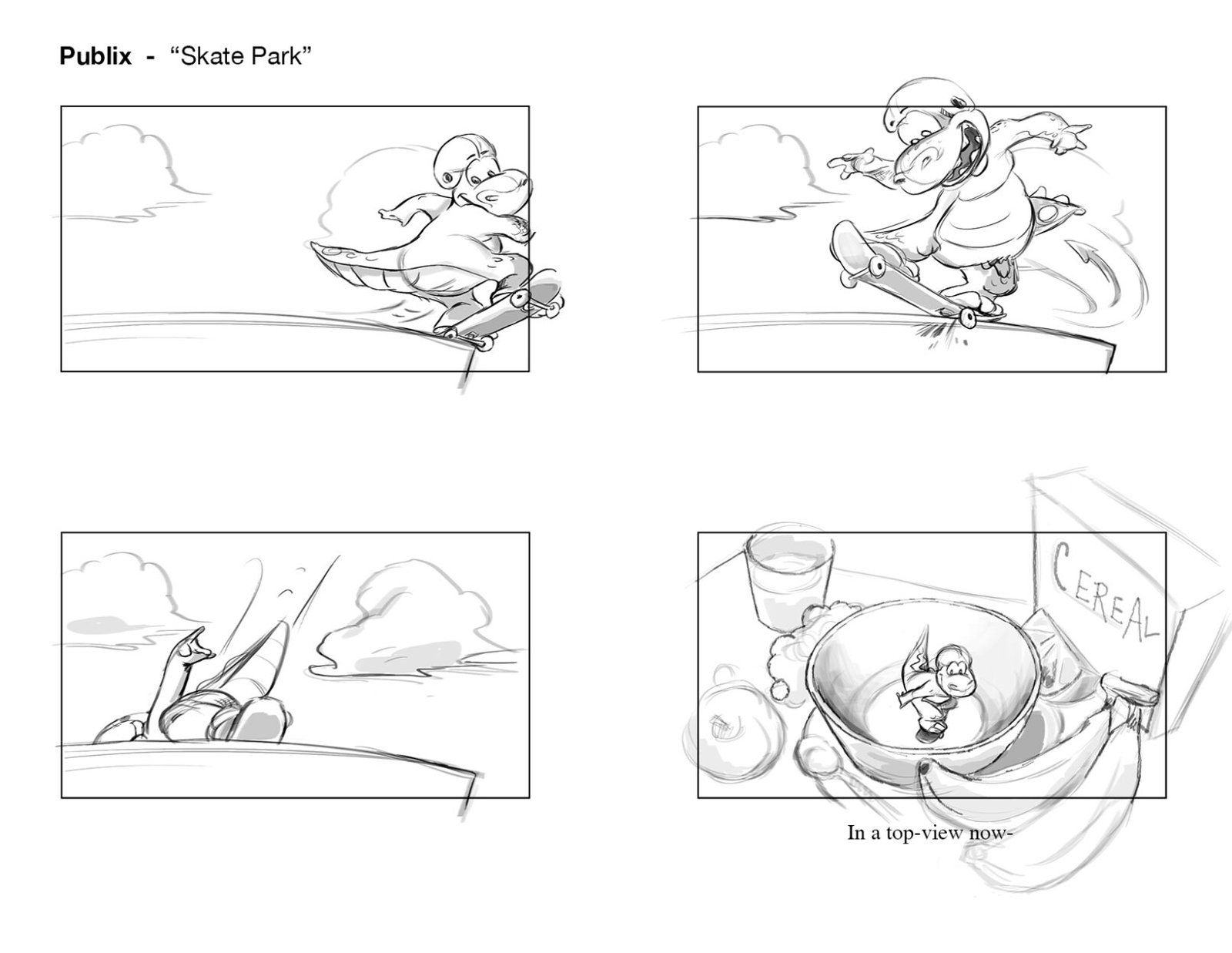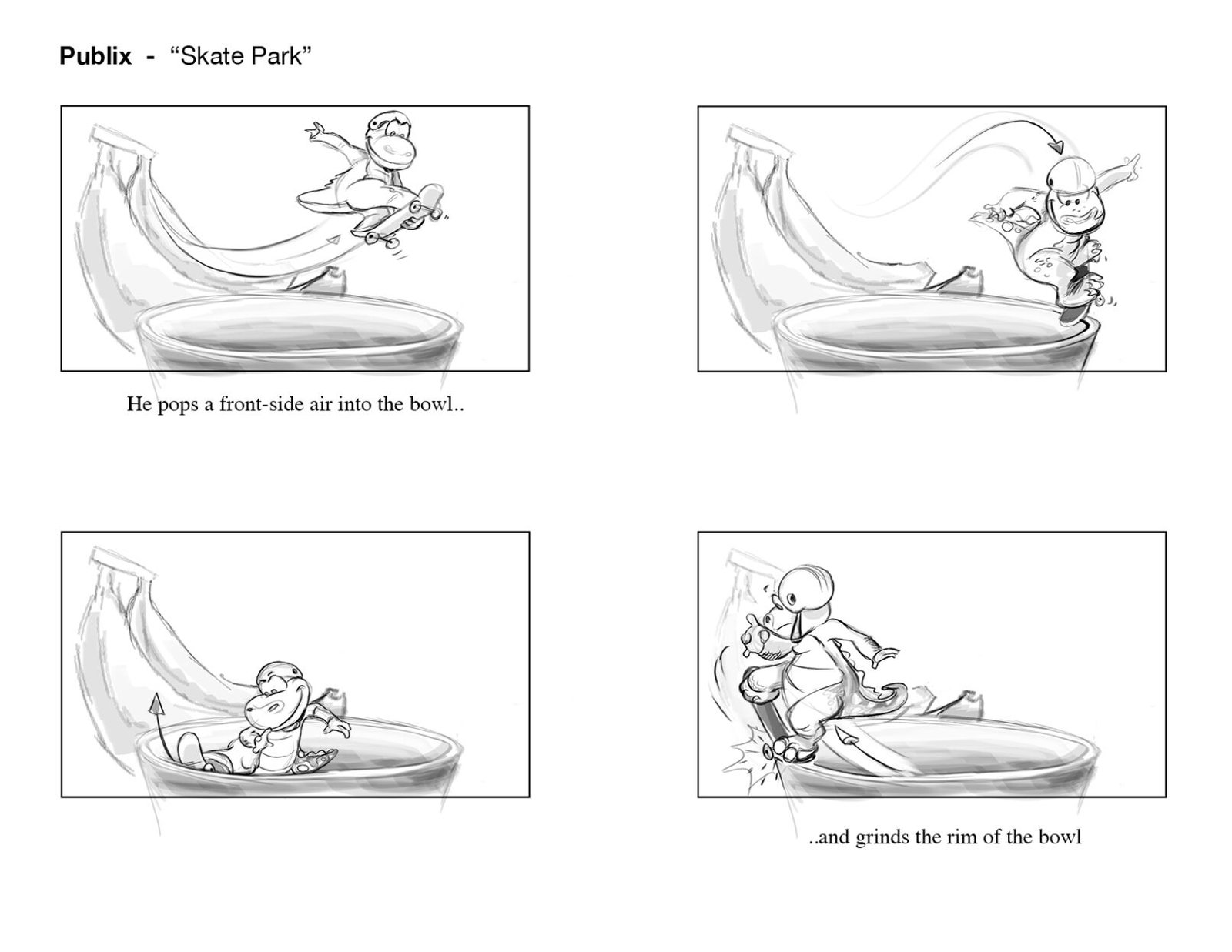 Plato shredding the bowl on his new Publix skateboard! An exciting part of this project was adapting Publix’s lovable “Plato” mascot to CG. Having already existed in previous commercials as a 2D character, there were certain characteristics that we needed to keep in tact, while developing his detail, expressiveness, and production quality significantly.